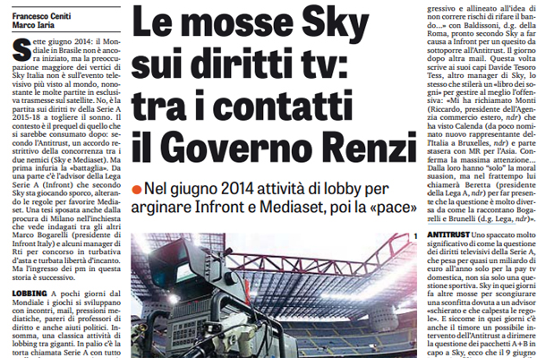 Gazzetta dello Sport, mosse Sky sui diritti tv: “Tra i contatti il Governo Renzi. Nel giugno 2014 attività di lobby per arginare Infront e Mediaset, poi la «pace»”