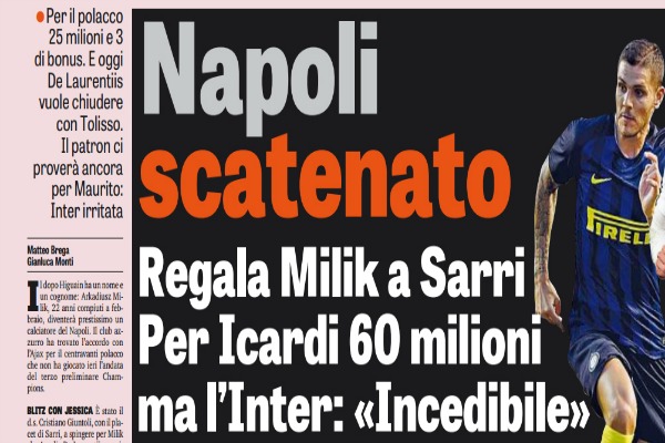 Gazzetta dello Sport: “Napoli scatenato regala Milik a Sarri; per Icardi 60 milioni, ma l’Inter: «Incedibile»”