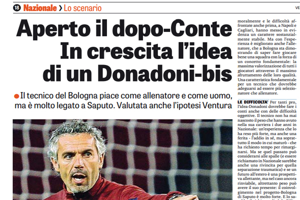 “Un Donadoni bis in azzurro: più che suggestione, ipotesi ragionata. Perché c’è almeno un vantaggio – se tale si può definire – in una così prematura, o comunque anticipata, certezza della separazione Conte-Nazionale dopo l’Europeo: ci sarà più tempo per prepararne la successione. Tempo per valutare pro e contro dei vari candidati e per sondare le reali possibilità di affidargli un incarico affascinante ma anche delicato come quello di c.t. PANORAMICA Proprio perché è impensabile che la federazione si faccia trovare impreparata di fronte ad una scelta così importante, è logico ipotizzare che una panoramica sia già iniziata, seppur a livello di semplici valutazioni. E diversi indizi oggi portano a credere che un’idea più delle altre abbia un indice di gradimento in crescita: Roberto Donadoni. Anche se non c’è stato ancora nessun contatto diretto, neppure a titolo di sondaggio esplorativo. Ci sarà il tempo – ma neanche così tanto – di farne, nel caso. Di sicuro l’attuale guida del Bologna piace come uomo e come allenatore e, particolare che non guasta, ha un passato su «quella» panchina. Facile ripensare ad un Europeo abbandonato dopo aver perso soltanto ai rigori contro una Spagna che si preparava a dominare ovunque: grazie a quella parentesi di due anni, Donadoni conosce già difficoltà e incognite di un mestiere che è molto particolare (e Conte ha dovuto capirlo presto). UOMO E ALLENATORE Da allora c’è stata una crescita ulteriore. E’ maturato ancora l’uomo: l’avventura (in ogni senso) di Parma lo ha fatto apparire solido moralmente e le difficoltà affrontate anche prima, a Napoli e Cagliari, hanno messo in evidenza un carattere sostanzialmente stabile. Ma con l’esperienza è migliorato anche l’allenatore, che a Bologna sta dimostrando di saper fare giocare bene una squadra con la forza di un concetto fondamentale: la massima valorizzazione di tutti i giocatori attraverso il massimo sfruttamento delle loro qualità. Una caratteristica fondamentale per un tecnico che dovrebbe adeguarsi ad essere più selezionatore che allenatore. LE DIFFICOLTA’ Per tanti pro, l’idea-Donadoni dovrebbe fare i conti anche con delle difficoltà oggettive. Il tecnico non ha mai nascosto il peso che hanno avuto nella sua carriera i due anni in Nazionale: un’esperienza che lo ha reso più forte, ma anche una ferita – l’addio in sé, ma soprattutto il modo in cui maturò – che ha richiesto tempo per rimarginarsi. Ma se quel passato può considerarsi alle spalle (e essere richiamato in Nazionale sarebbe anche una rivincita per quella separazione traumatica) e se un futuro all’estero è una prospettiva allettante, ma nel caso ancora rinviabile, altrettanto peso può avere il suo presente: il coinvolgimento nel progetto-Bologna di Saputo è molto forte. E lo sarebbe il richiamo di club d’élite colpiti dal suo lavoro di quest’anno, al di là delle disponibilità economiche che la federazione può garantire al futuro c.t. grazie al contributo dello sponsor. L’ALTRO IDENTIKIT Per questo nel prossimo mese saranno valutate anche strade alternative. E un altro identikit di allenatore con certe caratteristiche è quello di Giampiero Ventura: insegnante di calcio e tecnico di grande esperienza, abituato a navigare anche in mari difficili e gestore di uomini prima che di calciatori. Cairo ha manifestato la volontà di tenerselo stretto, ma non è così impensabile che il presidente del Toro consideri l’ipotesi di un’apertura di fronte alla prospettiva di favorire il suo tecnico, che vedrebbe la Nazionale come ideale chiusura del cerchio della sua lunghissima carriera”. Questo quanto si legge sull’edizione odierna de “La Gazzetta dello Sport”.