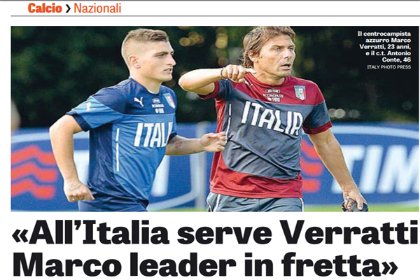 Gazzetta dello Sport, Nazionale: “Conte avvisa i parigini: «All’Italia serve Verratti, Marco leader in fretta. Sirigu? La chiamta va giustificata, se non gioca…»”