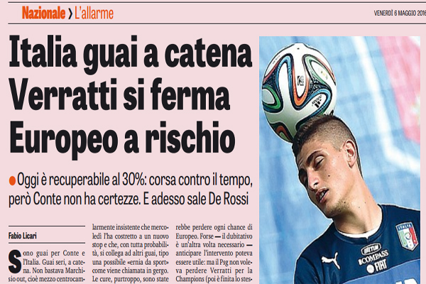 “Sono guai per Conte e l’Italia. Guai seri, a catena. Non bastava Marchisio out, cioè mezzo centrocampo. Sta precipitando anche la situazione Verratti: da Parigi arrivano brutte notizie. L’azzurro s’è fermato un’altra volta e adesso sembra a rischio anche per l’Europeo. Dove — se anche riuscisse a salire sull’ultimo treno disponibile — non sarebbe comunque al massimo. Conte dovrebbe rivedere un’altra volta la lista. E non è difficile immaginare che gente d’esperienza, vedi De Rossi, a questo punto potrebbe tornare d’attualità. Sempre a patto che la condizione fisica… MALEDETTA PUBALGIA Il problema di Verratti si chiama pubalgia. Una pubalgia particolarmente insistente che mercoledì l’ha costretto a un nuovo stop e che, con tutta probabilità, si collega ad altri guai, tipo una possibile «ernia da sport» come viene chiamata in gergo. Le cure, purtroppo, sono state poco efficaci finora: a Verratti basta correre poco per sentire dolore. Non gioca, s’allena male, è a corto di preparazione. Siamo realisti: in Francia a giugno, in ogni caso, avrebbe poca autonomia. Non il Verratti che ha fatto innamorare il Psg. OPERAZIONE? La questione poi si complica perché le esigenze legittime della Nazionale possono confliggere con quelle del club. Un intervento chirurgico, forse, potrebbe guarire Verratti. Non c’è dubbio che al Psg farebbe comodo, nel caso, farlo adesso per poi ritrovarsi il giocatore disponibile la prossima stagione: ma questo significherebbe perdere ogni chance di Europeo. Forse — il dubitativo è un’altra volta necessario — anticipare l’intervento poteva essere utile: ma il Psg non voleva perdere Verratti per la Champions (poi è finita lo stesso così). L’azzurro è molto preoccupato. La Nazionale idem: se le convocazioni fossero oggi, Verratti non potrebbe essere inserito tra i 23. A fine maggio, chissà. CANDIDATI Al momento Verratti non ha più del 30 per cento di possibilità di andare in Francia. Un improvviso miglioramento, invece, consentirebbe allo staff azzurro di lavorare sul parigino per recuperarlo alla causa, anche se certo non in tutte le partite della prima fase. Conte, al momento, non può che aspettare e rileggere il taccuino con la lista dei (sempre meno) selezionabili. Degli 8 centrocampisti «francesi», i sicuri, incrociando le dita, sono Parolo, Candreva, Giaccherini più Thiago Motta e Florenzi (entrambi con qualche problema, non grave). Restano in ballo tre posti: Soriano, Montolivo, De Rossi e Bernardeschi i legittimi aspiranti. Senza dimenticare Jorginho. Più i giovani Sturaro e Baselli e il «senatore» Pirlo. Oggi non si può più escludere nessuno. Saranno i test fisici a fare la prima selezione. QUALE SQUADRA Senza Verratti, in caso di 352, il centrocampo potrebbe essere composto da Candreva (o Florenzi, uno sulla fascia l’altro mezzala), Motta e Parolo. Nel 442 la coppia centrale potrebbe essere MottaParolo. Il laziale aveva fatto coppia (bene) con Verratti in Azerbaigian e con Marchisio in Belgio”. Questo quanto si legge sull’edizione odierna de “La Gazzetta dello Sport”.