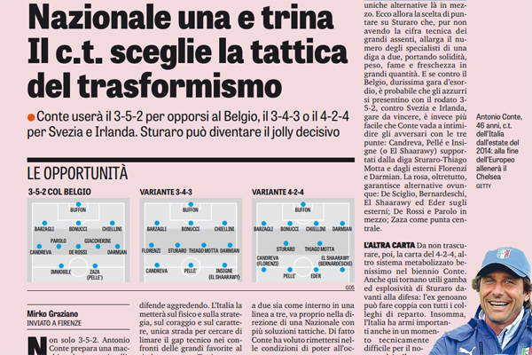 Gazzetta dello Sport: “Nazionale una e trina, il c.t. sceglie la tattica del trasformismo. Conte userà il 3-5-2 per opporsi al Belgio, il 3-4-3 o il 4-2-4 per Svezia e Irlanda. Sturaro può diventare il jolly decisivo”