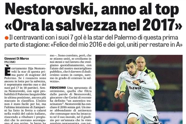 Gazzetta dello Sport: “Nestorovski, anno al top: «Ora la salvezza nel 2017»”
