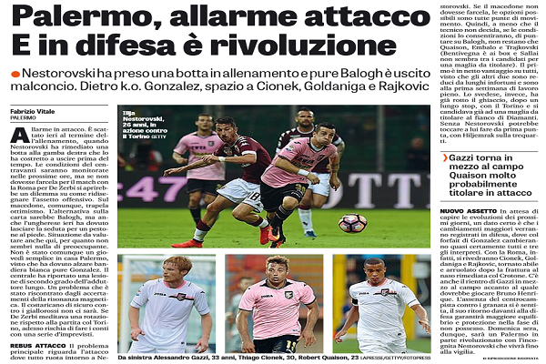 “Allarme in attacco. È scattato ieri al termine dell’allenamento, quando Nestorovski ha rimediato una botta alla gamba destra che lo ha costretto a uscire prima del tempo. Le condizioni del centravanti saranno monitorate nelle prossime ore, ma se non dovesse farcela per il match con la Roma per De Zerbi si aprirebbe un dilemma su come ridisegnare l’assetto offensivo. Sul macedone, comunque, trapela ottimismo. L’alternativa sulla carta sarebbe Balogh, ma anche l’ungherese ieri ha dovuto lasciare la seduta per un pestone al piede. Situazione da valutare anche qui, per quanto non sembri nulla di preoccupante. Non è stato comunque un giovedì semplice in casa Palermo, visto che ha dovuto alzare bandiera bianca pure Gonzalez. Il centrale ha riportato una lesione di secondo grado dell’adduttore lungo. Un problema che è stato riscontrato dagli accertamenti della risonanza magnetica. Il costaricano di sicuro contro i giallorossi non ci sarà. Se De Zerbi meditava una rotazione rispetto alla partita col Torino, adesso rischia di fare i conti con una serie d’imprevisti. REBUS ATTACCO Il problema principale riguarda l’attacco dove tutto ruota intorno a Nestorovski. Se il macedone non dovesse farcela, le opzioni possibili sono tutte punte di movimento. Quindi, a meno che il tecnico non decida, se le condizioni lo consentiranno, di puntare su Balogh, non restano che Quaison, Embalo e Trajkovski (Bentivegna è ai box e Sallai non sembra tra i candidati per una maglia da titolare). Il primo è in netto vantaggio su tutti, visto che gli altri due sono reduci da lunghi infortuni e sono alla prima settimana di lavoro pieno. Lo svedese, invece, ha già rotto il ghiaccio, dopo un lungo stop, con il Torino e si candidava già ad una maglia da titolare al fianco di Diamanti. Senza Nestorovski potrebbe toccare a lui fare da prima punta, con Hiljemrak sulla trequarti. NUOVO ASSETTO In attesa di capire le evoluzioni dei prossimi giorni, un dato certo è che i cambiamenti maggiori verranno registrati in difesa, dove col forfait di Gonzalez cambieranno quasi certamente tutti e tre gli interpreti. Con la Roma, infatti, si rivedranno Cionek, Goldaniga e Rajkovic, tornato abile e arruolato dopo la frattura al naso rimediata col Crotone. C’è anche il rientro di Gazzi in mezzo al campo accanto al quale dovrebbe giocare Bruno Henrique. L’assenza del centrocampista contro i granata si è sentita, il suo ritorno davanti alla difesa garantirà maggiore equilibrio e protezione nella fase di non possesso. Domenica sera, dunque, sarà un Palermo in parte rivoluzionato con l’incognita Nestorovski che vivrà fino alla vigilia”. Questo quanto si legge sull’edizione odierna de “La Gazzetta dello Sport”.
