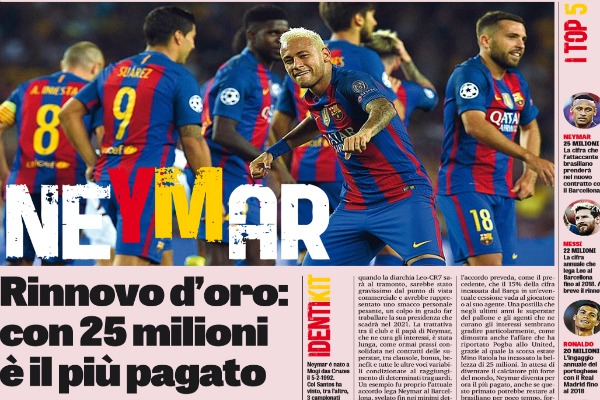 Gazzetta dello Sport: “Neymar, rinnovo d’oro: con 25 milioni è il più pagato. Ma resterà primo solo per poco…”