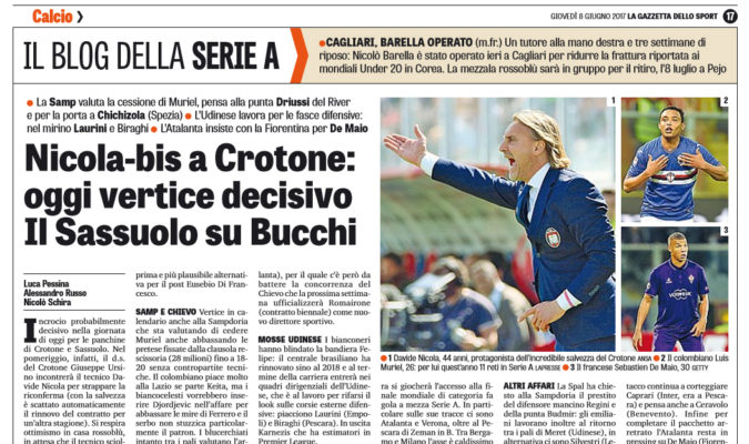 “Incrocio probabilmente decisivo nella giornata di oggi per le panchine di Crotone e Sassuolo. Nel pomeriggio, infatti, il d.s. del Crotone Giuseppe Ursino incontrerà il tecnico Davide Nicola per strappare la riconferma (con la salvezza è scattato automaticamente il rinnovo del contratto per un’altra stagione). Si respira ottimismo in casa rossoblù, in attesa che il tecnico sciolga le ultime riserve. Il Sassuolo, dal canto suo, non molla la presa sull’allenatore piemontese, ma continua a corteggiare con interesse Cristian Bucchi che resta la prima e più plausibile alternativa per il post Eusebio Di Francesco. SAMP E CHIEVO Vertice in calendario anche alla Sampdoria che sta valutando di cedere Muriel anche abbassando le pretese fissate dalla clausola rescissoria (28 milioni) fino a 1820 senza contropartite tecniche. Il colombiano piace molto alla Lazio se parte Keita, ma i biancocelesti vorrebbero inserire Djordjevic nell’affare per abbassare le mire di Ferrero e il serbo non stuzzica particolarmente il patron. I blucerchiati intanto tra i pali valutano l’argentino Chichizola (Spezia). Inoltre la Samp continua il pressing per l’attaccante argentino Driussi (River Plate) e per la mediana pensano al prestito di Grassi (Napoli, era all’Atalanta), per il quale c’è però da battere la concorrenza del Chievo che la prossima settimana ufficializzerà Romairone (contratto biennale) come nuovo direttore sportivo. MOSSE UDINESE I bianconeri hanno blindato la bandiera Felipe: il centrale brasiliano ha rinnovato sino al 2018 e al termine della carriera entrerà nei quadri dirigenziali dell’Udinese, che è al lavoro per rifarsi il look sulle corsie esterne difensive: piacciono Laurini (Empoli) e Biraghi (Pescara). In uscita Karnezis che ha estimatori in Premier League. L’ASTA Il talento più conteso in queste ore si chiama Luca Vido. Il gioiellino del Milan e della nazionale italiana under 20 che proprio oggi contro l’Inghilterra si giocherà l’accesso alla finale mondiale di categoria fa gola a mezza Serie A. In particolare sulle sue tracce ci sono Atalanta e Verona, oltre al Pescara di Zeman in B. Tra Bergamo e Milano l’asse è caldissimo e oltre ai big Kessie e Conti vede protagonista un altro giovane emergente: si tratta del terzino Felicioli, rientrato al Milan dopo l’esperienza in prestito all’Ascoli. ALTRI AFFARI La Spal ha chiesto alla Sampdoria il prestito del difensore mancino Regini e della punta Budmir: gli emiliani lavorano inoltre al ritorno tra i pali di Meret (Udinese), in alternativa ci sono Silvestri (Leeds), Bardi (Inter, era a Frosinone) e Gollini (Atalanta). Il Genoa è al lavoro per accaparrarsi due giovani dalla Juventus in prestito: Mandragora e Mattiello. Il Sassuolo per l’attacco continua a corteggiare Caprari (Inter, era a Pescara) e pensa anche a Ceravolo (Benevento). Infine per completare il pacchetto arretrato l’Atalanta resta in pressing su De Maio (Fiorentina), mentre il Bologna per l’attacco pensa all’argentino Ocampos tornato al Marsiglia dopo l’annata in prestito vissuta tra Genoa e Milan”. Questo quanto riportato da “La Gazzetta dello Sport”.