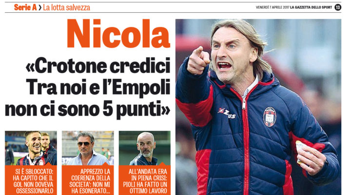 Gazzetta dello Sport, Nicola: “«Crotone credici. Tra noi e l’Empoli non ci sono 5 punti»”