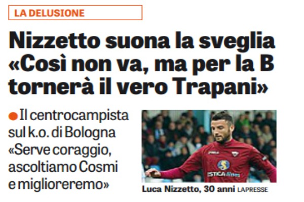 Gazzetta dello Sport: “Nizzetto suona la sveglia: «Così non va, ma per la B tornerà il vero Trapani». Il centrocampista sul k.o. di Bologna: «Serve coraggio, ascoltiamo Cosmi e miglioreremo»”
