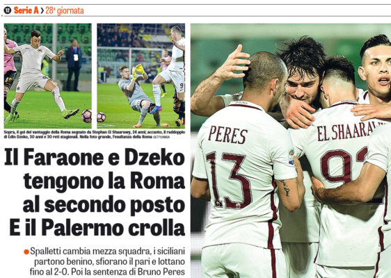 “Non basta una «Iena», per di più normalizzata dal ruolo presidenziale, per fermare un branco di lupi feriti, però come consuetudine tv almeno sa ficcare il naso tra i problemi. E così la «prima» di Paul Baccaglini da patron del Palermo finisce sì secondo pronostici – vince la Roma 03 grazie alle reti di El Shaarawy, Dzeko e Bruno Peres – ma anche con un caso bello chiaro che raccontiamo subito: al minuto 5 del primo tempo, un lancio di Chochev finisce sui piedi di Nestorovski che, da posizione defilata, fa partire un tirocross su cui Szczesny pasticcia buttandosi la palla in porta. Attimi di festa per i rosanero e di esitazione per Rocchi, che poi annulla perché, secondo lui Aleesami avrebbe toccato la palla per l’attaccante macedone, che a quel punto sarebbe in fuorigioco. Le immagini smentiscono, ma Baccaglini sa bene che «show must go on» e così da quel momento la gara s’incanala secondo i binari previsti, ovvero prezioso regalo della squadra giallorossa al presidente Pallotta, che oggi compie 59 anni, sperando di placarne i mugugni con la ritrovata vittoria dopo 3 sconfitte di fila e il risorpasso per il 2° posto ai danni del Napoli. ESORDI E TURNOVER In attesa della partita di ritorno di giovedì contro il Lione, Spalletti cambia 6 giallorossi rispetto ai titolari visti nell’andata di Europa League, con l’esordio dal 1’ dell’ottimo Grenier che, in coppia con Paredes, dà vita a una mediana tutta nuova, con Nainggolan in appoggio a un attacco di scattisti composto da Salah ed El Shaarawy, mentre Bruno Peres e Mario Rui si occupano delle fasce. Cambia anche Lopez che accantona Posavec e fa esordire in Serie A il giovane portiere Fulignati, finora visto solo in Coppa Italia. I rosanero, che tra l’altro devono fare a meno anche degli squalificati Rispoli e Balogh, hanno una modestia di fondo che il primo tempo evidenzia. La palla gira sempre con un tempo di ritardo, Nestorovski è isolato e la difesa fatica a tenere la linea del fuorigioco. Nessuna meraviglia, perciò, che il gioco lieviti solo nella ripresa, con l’ingresso di Diamanti, che almeno dà qualità sulla trequarti. Insomma, alla Roma basta chiudere bene le linee di passaggio e leggere i lanci per poi ripartire negli spazi. Al 22’, infatti, è già vantaggio, dopo che Grenier fa spiovere in area un cross per El Shaarawy su cui Morganella è in ritardo. Anzi, i giallorossi potrebbero anche raddoppiare se Rüdiger, servito da Paredes, non tirasse alto da ottima posizione (38’) e una bella combinazione SalahGrenierNainggolan non fosse finalizzata per centimetri (42’). DZEKO TRENTA Nel segno di Diamanti, la ripresa è più vivace. Il primo intervento però è di Fulignati, che stoppa la doppietta di El Shaarawy. Poi però arriva del lavoro anche per Szczesny, che nel giro di 10’ dice di no a un bel diagonale proprio di Diamanti e un tiro di Morganella. Sono passati 15 minuti del secondo tempo, ma basta l’ingresso di Dzeko e il disegno di un 343 più solido nel tenere la palla alta per sgonfiare i rosanero. Il bosniaco prima tira alto un campanile di Fulignati, poi però chiude la partita segnando su suggerimento di Nainggolan su cui Andelkovic annega (31’). Per il centravanti è il 30° gol stagionale, ma la festa giallorossa non è finita, perché al 46’ in contropiede, su assist di Strootman, Bruno Peres fa tris. E buon per i rosanero che Totti decida di non entrare per un mal di schiena che gonfia subito un minicaso. Morale: il Palermo deve trovare avversari del suo livello per salvarsi, mentre la Roma fa il rabbocco di punti e fiducia in vista del Lione. Giovedì, in fondo, sarà gloria o processi”. Questo quanto si legge su “La Gazzetta dello Sport”.