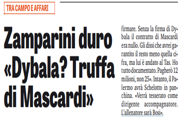 Gazzetta dello Sport: “Non c’è mai pace a Palermo. Zamparini duro: «Dybala? Truffa di Mascardi»”