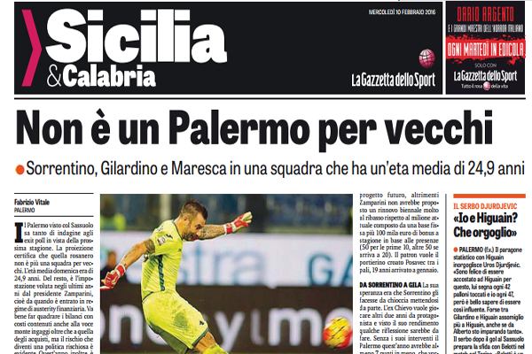 “Il Palermo visto col Sassuolo sa tanto di indagine agli exit poll in vista della prossima stagione. La proiezione certifica che quella rosanero non è più una squadra per vecchi. L’età media domenica era di 24,9 anni. Del resto, è l’impostazione voluta negli ultimi anni dal presidente Zamparini, cioè da quando è entrato in regime di austerity finanziaria. Va bene far quadrare i bilanci con costi contenuti anche alla voce monte ingaggi oltre che a quella degli acquisti, ma il rischio che diventi una politica rischiosa è evidente. Quest’anno, inoltre, è stato dato un colpo di forbice netto alla vecchia guardia che negli ultimi due anni aveva costituito l’ossatura della squadra. Basti pensare a Rigoni, prima epurato e poi ceduto o la gestione schizofrenica di Maresca tagliato e reintegrato due volte in pochi mesi. Insieme a Barreto, andato in scadenza la scorsa stagione, costituivano il centrocampo sul quale Iachini aveva fondato i successi del Palermo. Novantasette anni in tre, contro i 68 complessivi di Hiljemark, Brugman e Chochev con l’inevitabile differenza di rendimento in chiave tattica. DOVE SONO I LEADER? Oggi, a parte Sorrentino, si fa fatica a cercare qualcuno a cui dare la fascia di capitano. Lasciamo stare Vazquez che andrà via a giugno, forse l’unico è Gilardino, ma su di lui va fatta un’attenta riflessione, oppure Morganella che a 26 anni è l’elemento con più esperienza. E il problema di individuare un nuovo leader si porrà a giugno, perché il portiere andrà via, al di là delle dichiarazioni di facciata. L’uomo che sta portando il Palermo alla salvezza grazie alle sue parate non rientra nel progetto futuro, altrimenti Zamparini non avrebbe proposto un rinnovo biennale molto al ribasso rispetto al milione attuale composto da una base fissa più 100 mila euro di bonus a stagione in base alle presenze (50 per le prime 10, altre 50 se arriva a 20). Il patron vuole il portierino croato Posavec tra i pali, 19 anni arrivato a gennaio. DA SORRENTINO A GILA La sua speranza era che Sorrentino gli facesse da chioccia mettendosi da parte. L’ex Chievo vuole giocare altri due anni da protagonista e visto il suo rendimento qualche riflessione sarebbe da fare. Senza i suoi interventi il Palermo quest’anno avrebbe almeno 7 punti in meno, che vorrebbe dire zona retrocessione. Alcuni tifosi su Twitter si sono già mobilitati con un movimento denominato con l’hastag #savesorrentino, salviamo Sorrentino. Il comparto esperienza si assottiglierà anche con l’addio di Maresca il cui contratto scade a giugno e qui arriviamo a Gilardino. L’attaccante preso in estate al fotofinish per l’impossibilità di arrivare agli obiettivi prefissati e un altro che rientra abbondantemente nel club degli “Enta”. Per questo viene messo spesso in dubbio nelle scelte dell’undici iniziale. Non sarà più un ragazzino ma è il bomber con 6 gol. Bisogna vedere cosa accadrà a giugno anche se Gila è forte di altri 2 anni di contratto”. Questo è quanto riporta l’edizione odierna de “La Gazzetta dello Sport”.