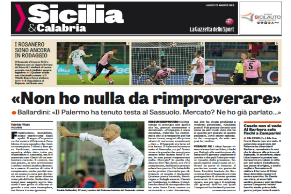 “Frustrazione, insoddisfazione soprattutto dagli spalti. Il segno d’impotenza che mostra il Palermo è l’emblema di una squadra che risulta incompiuta. I tifosi a fine gara fischiano, nonostante la squadra abbia dato tutto per riacciuffare il Sassuolo, ma si è scontrata con i limiti di un intelaiatura carente. Il «vorrei, ma non posso», se non arriveranno i rinforzi mirati sembra destinato a essere il motivo di tutto il campionato, anche perché senza un uomo in zona gol che faccia sentire il suo peso diventa tutto più difficile. Ballardini, in tempi non sospetti aveva lanciato il suo grido di allarme riguardo a una rosa incompleta, ma finora è stato ignorato. NESSUN RIMPROVERO Nel frattempo si arrangia con quello che ha, giovani scommesse e debuttanti. «L’impegno è stato massimo, Palermo ha confermato che le prerogative per far bene ci sono, magari alla prima alcuni di noi erano emozionati – dice –. Il Sassuolo sta bene ed è in forma. Il Palermo ha tenuto testa al Sassuolo, un po’ l’emozione e le gambe che non girano ancora bene hanno fatto il resto. Io non posso rimproverare nulla. Mercato? Io quello che dovevo dire l’ho detto, ora c’è il campionato, dobbiamo pensare solo a fare punti». Ha fatto delle scelte precise il tecniche per affrontare al meglio il Sassuolo: Quaison punta centrale, Bentivegna e Balogh esterni, Cionek per Goldaniga in difesa. Il risultato ha detto di una squadra che ha retto bene l’urto contro un avversario a tratti devastante, ma che ha avuto problemi a rendersi pericolosa. «Quaison punta? Può giocare davanti così come in altri ruoli visto che ha le qualità per giocare in queste posizioni. Deve essere sostenuto dai compagni, da solo non può far molto». POSAVEC OK I tifosi hanno visto e si sono fatti un’idea, i fischi per Balogh alla sostituzione dicono che il giovane ungherese è acerbo e che può finire per venire travolto dalla pressione. Segnali positivi continuano ad arrivare da parte di Posavec. Il portierino croato sta gestendo bene l’eredità lasciata da Sorrentino. Con il Sassuolo si è reso protagonista di almeno quattro interventi. Si è arreso solo a un rigore, ma per ora è il migliore dei giovani dell’Est sui quali Zamparini ha deciso di puntare.”. Questo quanto si legge sull’edizione odierna de “La Gazzetta dello Sport.