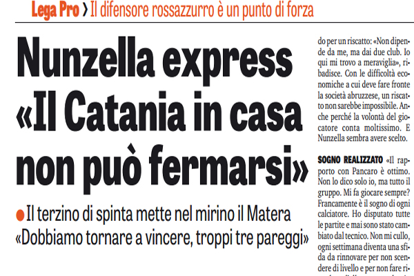 “In un momento in cui il mercato impazza, ma in casa rossazzurra non si fanno rivoluzioni, il sempre presente Leo Nunzella – al quale la società affiancherà un nuovo acquisto per creare una valida alternativa – ieri ha rinnovato l’atto d’amore nei confronti del Catania: «Mi piacerebbe rimanere qui, non solo perché ambiente, tifosi, città sono roba da categorie superiori, ma pure perché nonostante tutto abbiamo dimostrato la nostra forza e c’è un progetto che non si esaurisce all’annata attuale, ma guarda con fiducia più in avanti». OPERAZIONE DELICATA Chi scopre il Catania, o ha la fortuna di approdare in città e mettere piede al Massimino, difficilmente chiede di andare via. Il fatto è che Nunzella è arrivato in Sicilia dal Lanciano, con la formula del prestito e i dirigenti che si occupano di mercato, sotto sotto, stanno lavorando per un riscatto: «Non dipende da me, ma dai due club. Io qui mi trovo a meraviglia», ribadisce. Con le difficoltà economiche a cui deve fare fronte la società abruzzese, un riscatto non sarebbe impossibile. Anche perché la volontà del giocatore conta moltissimo. E Nunzella sembra avere scelto. SOGNO REALIZZATO «Il rapporto con Pancaro è ottimo. Non lo dico solo io, ma tutto il gruppo. Mi fa giocare sempre? Francamente è il sogno di ogni calciatore. Ho disputato tutte le partite e mai sono stato cambiato dal tecnico. Non mi cullo, ogni settimana diventa una sfida da rinnovare per non scendere di livello e per non fare ricredere l’allenatore sul mio conto. Nessuno ha il posto assicurato, Pancaro sceglie in base al rendimento in allenamento». Il pregio di Nunzella è la velocità: recupero in diagonale, ripatenza fulminante. Nunzella Express ha colpito nel segno, tanto da interessare molti operatori di mercato. Il Catania sembra avere la priorità. IL MATERA La partita con il Matera sarà da vincere: «Veniamo da tre pareggi, raccogliendo meno di quello che avremmo meritato – confessa il terzino – di fronte al nostro pubblico dobbiamo forzare il lucchetto avversario e segnare. Io avanzato? Cerco di guadagnare spesso il fondo per i cross. In copertura, il nuovo arrivato Di Cecco (ex del Lanciano, hanno giocato insieme, ndr) mi facilita il compito coprendo gli spazi che lascio vuoti quando avanzo dalla linea difensiva». Un passo indietro: «A Cosenza e Andria avremmo potuto vincere. E’ tempo di dimostrare al più presto chi siamo e arrivare in fretta alla salvezza»”. Questo quanto si legge su “La Gazzetta dello Sport”.