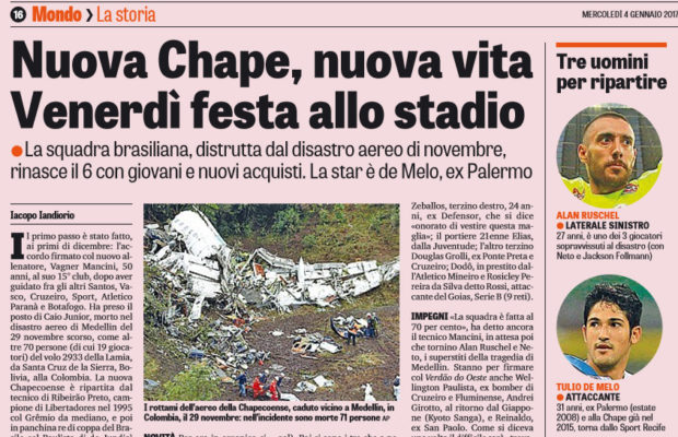 “Il primo passo è stato fatto, ai primi di dicembre: l’accordo firmato col nuovo allenatore, Vagner Mancini, 50 anni, al suo 15° club, dopo aver guidato fra gli altri Santos, Vasco, Cruzeiro, Sport, Atletico Paranà e Botafogo. Ha preso il posto di Caio Junior, morto nel disastro aereo di Medellin del 29 novembre scorso, come altre 70 persone (di cui 19 giocatori) del volo 2933 della Lamia, da Santa Cruz de la Sierra, Bolivia, alla Colombia. La nuova Chapecoense è ripartita dal tecnico di Ribeirão Preto, campione di Libertadores nel 1995 col Grêmio da mediano, e poi in panchina re di coppa del Brasile col Paulista di de Jundiaì nel 2005, e nel 2016 campione del Baiano col Vitoria. Insomma uno con una quindicina d’anni di esperienza. Il giorno della Befana, venerdì, Mancini presenta all’Arena Condà la nuova rosa della Chape che sarà in campo per il primo match ufficiale, nella Primeira Liga (torneo infrastatuale del SudMinasRio de Janeiro), il 26 gennaio col Joinville e 3 giorni dopo debutta nel torneo statale (il Catarinense, di cui è campione in carica) contro l’Internacional SC. NOVITÀ Per ora in organico ci sono una ventina di elementi, fra i «primavera» promossi (11) e nuovi arrivi. Fra questi il più noto è l’ex palermitano (estate 2008) Tulio de Melo, 32 anni a fine mese, una carriera esplosa con Rudi Garcia nel 200708 a Lilla (13 gol in Ligue 1, accanto all’ex romanista Gervinho), dove vinse il titolo nel 2011. Ma in Sicilia «mi ero accordato con Rino Foschi e l’allenatore Guidolin; e presto cambiarono il dirigente e il tecnico», ha detto Tulio, che con la Chape ha giocato nel 2015 (13 match e 5 gol). Poi ci sono i tre che a novembre non erano in volo col team perché infortunati: l’argentino Alejandro Martinuccio, punta, ex Peñarol e Fluminense; Neném, centrocampista qui dal 2009, e Moisés, altro centrocampista rientrato dal Giappone (Fukuoka). «Loro saranno importanti per ripartire, perché di esperienza», ha detto il tecnico Mancini. Fra i nuovi, oltre a Tulio, ingaggiati dal d.s. José Carlos Maringà, ci sono il 21enne Wesley Natà, punta, ex Chape e in prestito dal Bahia neopromosso; l’uruguayano Zeballos, terzino destro, 24 anni, ex Defensor, che si dice «onorato di vestire questa maglia»; il portiere 21enne Elias, dalla Juventude; l’altro terzino Douglas Grolli, ex Ponte Preta e Cruzeiro; Dodô, in prestito dall’Atletico Mineiro e Rosicley Pereira da Silva detto Rossi, attaccante del Goias, Serie B (9 reti). IMPEGNI «La squadra è fatta al 70 per cento», ha detto ancora il tecnico Mancini, in attesa poi che tornino Alan Ruschel e Neto, i superstiti della tragedia di Medellin. Stanno per firmare col Verdão do Oeste anche Wellington Paulista, ex bomber di Cruzeiro e Fluminense, Andrei Girotto, al ritorno dal Giappone (Kyoto Sanga), e Reinaldo, ex San Paolo. Come si diceva una volta il difficile sarà «trovare l’amalgama». Anche perché bisogna far presto: dal 7 marzo inizia la coppa Libertadores nella fase a gironi, dove la Chape è al debutto assoluto, contro Nacional (Uruguay), Lanus argentino e Zulia (Venezuela). Intanto proprio ieri la maglia verde della Chape è tornata in campo con la Under 20 nella Copa San Paolo (contro la Nova Iguaçu), la più importante manifestazione brasiliana di categoria. Verde come la speranza”. Questo quanto riportato da “La Gazzetta dello Sport”.