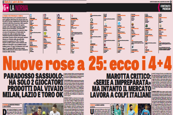 Gazzetta dello Sport: “Nuove rose a 25, ecco i 4+4 prodotti dal vivaio: Milan, Lazio e Toro ok. Palermo…”