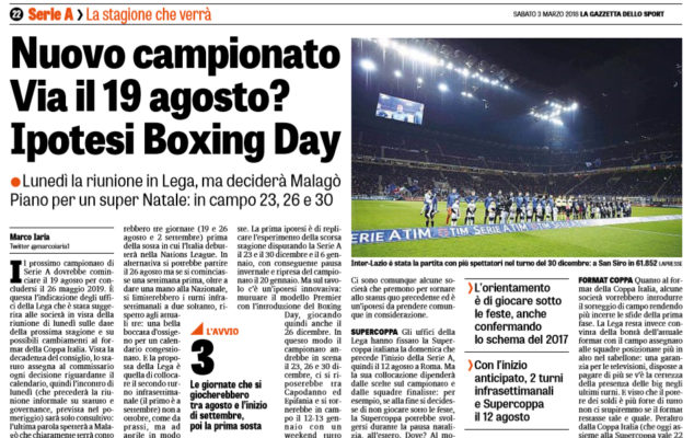 Gazzetta dello Sport: “Nuovo campionato. Via il 19 agosto? Ipotesi Boxing Day. Le date nei dettagli”