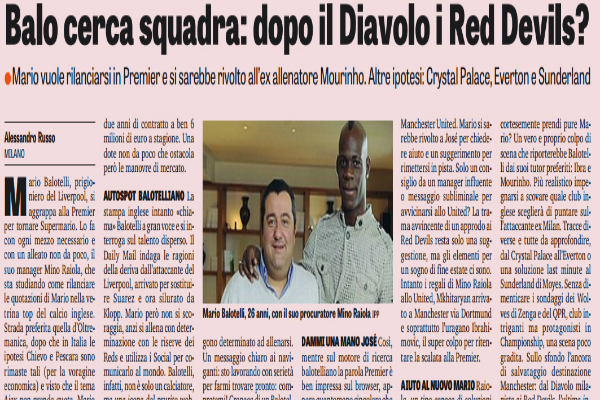 “Mario Balotelli, prigioniero del Liverpool, si aggrappa alla Premier per tornare Supermario. Lo fa con ogni mezzo necessario e con un alleato non da poco, il suo manager Mino Raiola, che sta studiando come rilanciare le quotazioni di Mario nella vetrina top del calcio inglese. Strada preferita quella d’Oltremanica, dopo che in Italia le ipotesi Chievo e Pescara sono rimaste tali (per la voragine economica) e visto che il tema Ajax non prende quota. Mario attende tutti al varco, entro il 31 agosto, col rischio di restare bloccato ai Reds e forte di altri due anni di contratto a ben 6 milioni di euro a stagione. Una dote non da poco che ostacola però le manovre di mercato. AUTOSPOT BALOTELLIANO La stampa inglese intanto «chiama» Balotelli a gran voce e si interroga sul talento disperso. Il Daily Mail indaga le ragioni della deriva dall’attaccante del Liverpool, arrivato per sostituire Suarez e ora silurato da Klopp. Mario però non si scoraggia, anzi si allena con determinazione con le riserve dei Reds e utilizza i Social per comunicarlo al mondo. Balotelli, infatti, non è solo un calciatore, ma una icona del prurito web. Riesce facile dunque autopromuoversi con diverse foto postate su Instagram che lo ritraggono determinato ad allenarsi. Un messaggio chiaro ai naviganti: sto lavorando con serietà per farmi trovare pronto: compratemi! Cronaca di un Balotelli rinvigorito dall’astinenza dai campi di gioco che punta forte su stesso. DAMMI UNA MANO JOSÉ Così, mentre sul motore di ricerca balotelliano la parola Premier è ben impressa sul browser, appare quantomeno singolare che nei giorni scorsi sia andato in scena un incontro tra Balotelli e Mourinho, nuovo manager del Manchester United. Mario si sarebbe rivolto a José per chiedere aiuto e un suggerimento per rimettersi in pista. Solo un consiglio da un manager influente o messaggio subliminale per avvicinarsi allo United? La trama avvincente di un approdo ai Red Devils resta solo una suggestione, ma gli elementi per un sogno di fine estate ci sono. Intanto i regali di Mino Raiola allo United, Mkhitaryan arrivato a Manchester via Dortmund e soprattutto l’uragano Ibrahimovic, il super colpo per ritentare la scalata alla Premier. AIUTO AL NUOVO MARIO Raiola, un tipo capace di soluzioni impreviste, potrebbe chiedere l’aiutino allo Special One: ti ho portato Zlatan ed Henrikh, ora cortesemente prendi pure Mario? Un vero e proprio colpo di scena che riporterebbe Balotelli dai suoi tutor preferiti: Ibra e Mourinho. Più realistico impegnarsi a scovare quale club inglese sceglierà di puntare sull’attaccante ex Milan. Tracce diverse e tutte da approfondire, dal Crystal Palace all’Everton o una soluzione last minute al Sunderland di Moyes. Senza dimenticare i sondaggi dei Wolves di Zenga e del QPR, club intriganti ma protagonisti in Championship, una scena poco gradita. Sullo sfondo l’ancora di salvataggio destinazione Manchester: dal Diavolo milanista ai Red Devils, l’ultima incredibile capriola di mercato per rilanciare Mario?”. Questo quanto si legge sull’edizione odierna de “La Gazzetta dello Sport”.