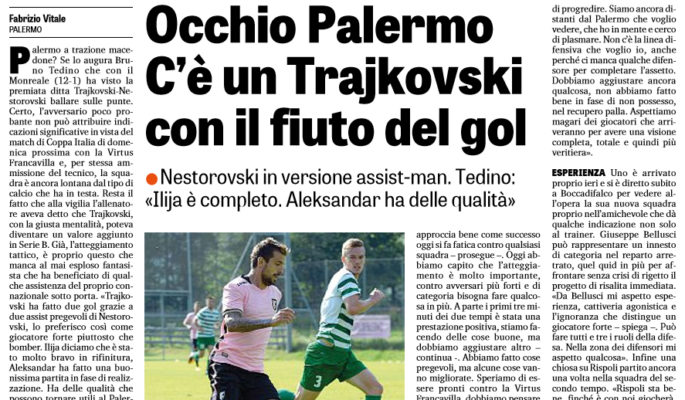 Palermo a trazione macedone? Se lo augura Bruno Tedino che con il Monreale (12-1) ha visto la premiata ditta Trajkovski-Nestorovski ballare sulle punte. Certo,l ’avversario poco probante non può attribuire indicazioni significative in vista del match di Coppa Italia di domenica prossima con la Virtus Francavilla e, per stessa ammissione del tecnico, la squadra è ancora lontana dal tipo di calcio che ha in testa. Resta il fatto che alla vigilia l’allenatore aveva detto che Trajkovski, con la giusta mentalità, poteva diventare un valore aggiunto in Serie B. Già, l’atteggiamento tattico, è proprio questo che manca al mai esploso fantasista che ha beneficiato di qualche assistenza del proprio connazionale sotto porta. «Trajkovski ha fatto due gol grazie a due assist pregevoli di Nestorovski, lo preferisco così come giocatore forte piuttosto che bomber. Ilija diciamo che è stato molto bravo in rifinitura, Aleksandar ha fatto una buonissima partita in fase di realizzazione. Ha delle qualità che possono tornare utili al Palermo». C’è ancora molta strada da fare, Tedino ha approfittato delle soste in cui la squadra si è dissetata per spiegare ulteriormente alcuni concetti.