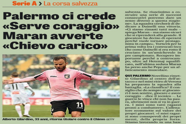 Gazzetta dello Sport: “Palermo ci crede, Novellino: «Serve coraggio»; Maran avverte: «Chievo carico»”