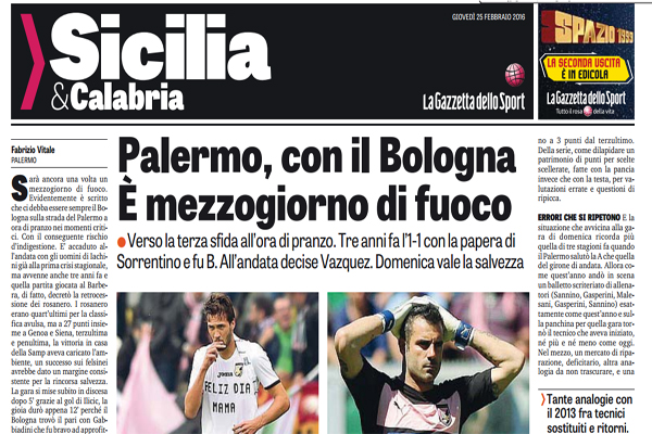Gazzetta dello Sport: “Palermo, con il Bologna è mezzogiorno di fuoco. Tre anni fa l’1-1 con la papera di Sorrentino e fu B. Domenica vale la salvezza”