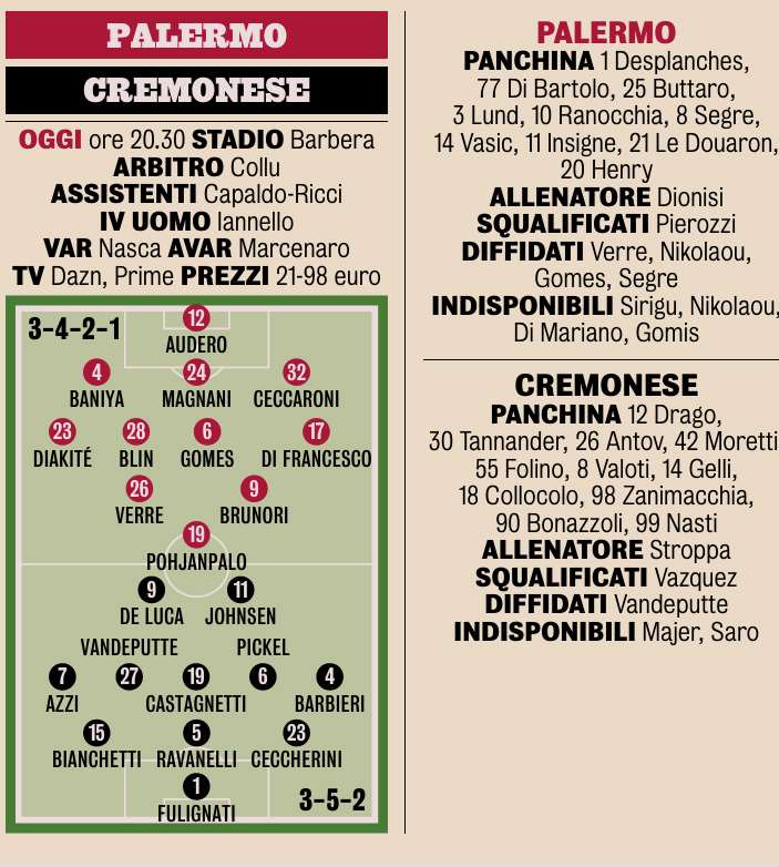 In attacco, nessuna sorpresa: Pohjanpalo sarà il riferimento offensivo, con Verre e il capitano Brunori alle sue spalle. Grande attesa anche per il pubblico del Renzo Barbera, dove sono attesi 21-22 mila spettatori, segnale di un rinnovato entusiasmo tra i tifosi.