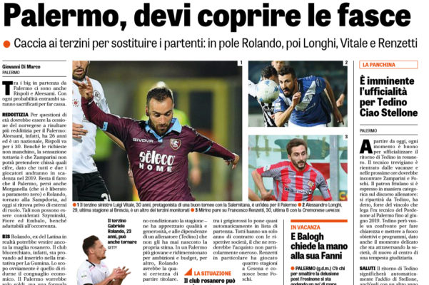 Gazzetta dello Sport: “Palermo, devi coprire le fasce. Caccia ai terzini per sostituire i partenti: in pole Rolando, poi Longhi, Vitale e Renzetti”