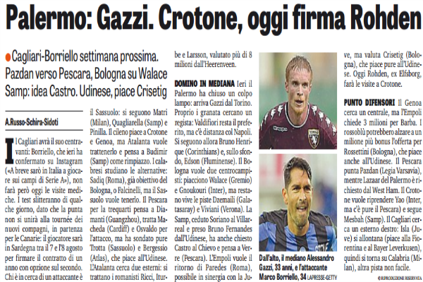 Gazzetta dello Sport: “Palermo: Gazzi. Crotone, oggi firma Rohden”