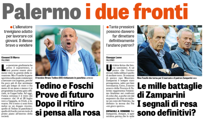 “La questione giudiziaria ha preso il sopravvento, e non poteva essere altrimenti visto la gravità della situazione. Ma c’è anche la parte sportiva sulla quale cominciare a lavorare con urgenza, perche fra poco più di due settimane sarà gia tempo di ritiro e fra meno di un mese e mezzo è in programma la prima gara ufficiale, in Coppa Italia. Ad oggi, l’unica certezza è il ritiro dei rosanero: dal 14 at 28 luglio tutti a Sappada, in Friuli, a lavorare. Per il resto ci sono forti indizi su un doppio ritorno, quello di Tedino in panchina e quello di Foschi con un ruolo di primo piano all’interno della società. […] Un’altra ferita che brucia tantissimo. A tal punto che l’istinto dettato dalla rabbia è quello di mollare tutto. Di reazioni di questo tipo Maurizio Zamparini è sempre stato protagonista, salvo poi fare retromarcia. Certo, il nuovo attacco della Procura di Palermo rappresenta l’ennesimo fendente nei confronti di colui che, a poche ore dal sequestro da oltre un milione sui conti del Palermo, ha definito la mossa dei Pm un gioco sporco”. Questo quanto riportato dall’edizione odierna de “La Gazzetta dello Sport”.