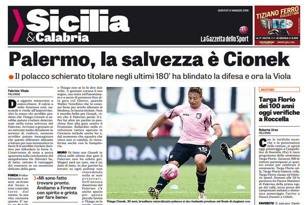 “Da oggetto misterioso a uomo-­chiave. Il calcio a volte funziona così, nasconde e rivela all’improvviso. Alzi la mano chi avrebbe predetto che Thiago Cionek si sarebbe potuto rivelare determinate nella corsa salvezza del Palermo. Arrivato a gennaio in un mercato molto deludente in termini di rinforzi, nessuno avrebbe potuto immaginare che questo difensore abituato a lottare per non retrocedere in Serie B si sarebbe rivelato decisivo per difendere la Serie A. L’intervento di testa a porta sguarnita sulla conclusione del sampdoriano De Silvestri ha, di fatto, salvato il vantaggio dei rosanero in un momento delicato della gara. FORZA Probabilmente è essere arrivato dal basso e aver costruito t u t t o d a l niente, la sua vita racconta questo. E’ nato in Brasile dove muove i primi passi col Clube de Regatas Brasil, in serie B, nel quale gioca tre stagioni fino a quando non si trasferisce in Polonia e ne acquisisce la cittadinanza grazie ai bisnonni paterni. A scoprirlo in Basile è un procuratore italiano, Grabriel Giuffrida che lo porta allo Jagiellonia, formazione del massimo campionato polacco. GRANDE SALTO L’Italia è il grande sogno e si concretizza quando il Padova ne rileva il cartellino nel 2012. Dopo appena una stagione passa a titolo temporaneo al Modena, dove resterà per tre stagioni, perché nel frattempo la mancata iscrizione del Padova al campionato lo svincola. In Emilia diventa il leader del canarini fino all’inaspettata chiamata dalla Serie A. A 30 anni è l’ultimo treno per il calcio che conta e Thiago non se lo fa dire due volte. A gennaio corona il suo sogno, ma resta nell’anonimato e a secco di presenze fino alla gara col Chievo, quando Walter Novellino che lo conosce bene per averlo allenato al Modena, lo lancia titolare. Non è esordio bello per Cionek, visto che il Palermo perde 3­1. Per lui altre tre partite in panchina fino alla gara contro il Frosinone. Ballardini nella rivoluzione tattica operata in Ciociaria include anche lui e, dal momento che squadra che vince non si cambia, lo riconferma anche con la Sampdoria. MURO Di fatto con Cionek in difesa nelle ultime due gare il Palermo non ha subito gol. Magari sarà un caso, ma è un dato di fatto. In due partite ha lottato su ogni pallone non concedendo nulla ai suoi a v v e r s a r i . Nell’annata disastrosa del Palermo c’è anche spazio per questa piccola favola e Thiago se la vuole vivere fino in fondo. «Non giocare non è stato facile. Ho lavorato per farmi trovare pronto ed è andata bene così. Come è successo col Frosinone stiamo cercando di non fare calcoli e guardare alla singola partita. Quello fatto con la Sampdoria è un grande passo ma c’è ancora da pedalare – ha detto Cionek domenica scorsa a fine gara ­. Andiamo a Firenze con lo stesso spirito, abbiamo trovato la grinta giusta e così possiamo fare bene anche al Franchi». SCARAMANZIA Adesso toccherà a Ballardini decidere se mantenerlo nel terzetto difensivo, visto anche il rientro di Gonzalez. Cionek si giocherà una maglia con Vitiello. Le valutazioni tecniche si scontreranno, di certo anche con la scaramanzia, per il “non c’è due senza tre”. Questo quanto si legge sull’edizione odierna de “La Gazzetta dello Sport”.