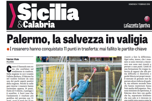 Gazzetta dello Sport: “Palermo, la salvezza in valigia. Undici punti conquistati in trasferta e partite chiave mai fallite”