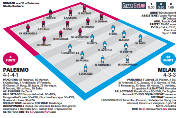 Gazzetta dello Sport: Palermo-Milan, le probabili formazioni Segui Ilovepalermocalcio su Google News Redazione Ilovepalermocalcio Novembre 5, 2016 Ecco le probabili formazioni della gara di domani alle 15 tra Palermo e Milan, proposte nell’edizione odierna de “La Gazzetta dello Sport”: