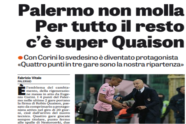 EMPOLI A NOI DUE Quaison confida nel momento della squadra che in trasferta sta avendo un rendimento molto positivo. «Dopo Natale torneremo a Palermo con grinta, pronti per allenarci in vista del l’Empoli – continua lo svedese –. Sarà una partita importante, come quella col Pescara e vogliamo regalare una gioia ai nostri tifosi che anche l’altra sera sono stati perfetti. Io, come i miei compagni, li vorrei sempre così caldi per tutta la partita». Robin vuole battere il ferro mentre è caldo, non solo a livello di rendimento collettivo ma anche personale e non interrompere il feeling con il gol. Corini ha puntato dritto su di lui fin dal suo arrivo e il centrocampista con vocazione da goleador non intende deludere. Il suo contratto è in scadenza, proseguire con questo tipo di prestazioni potrebbe accelerare le manovre per il rinnovo o proiettarlo verso club più importanti, anche se per il Palermo sarebbe un grave errore perderlo a parametro zero. «Sono contento di quello che sto facendo, sto giocando un po’ meglio di prima, ma posso fare sempre di più. Per il 2017 mi auguro di continuare su questa strada. Questo vale per me, per i miei compagni e per la società. L’impegno non manca, facendo così arriveranno i risultati». Lui ne è certo ed è la missione del Palermo”. Questo ciò che si legge sull’edizione odierna de “La Gazzetta dello Sport”.