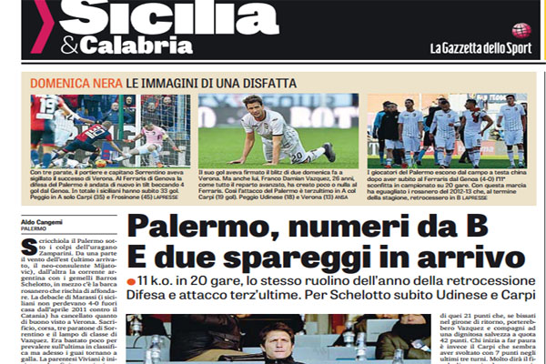 “Scricchiola il Palermo sotto i colpi dell’uragano Zamparini. Da una parte il vento dell’est (ultimo arrivato, il neo-consulente Mijatovic), dall’altra la corrente argentina con i gemelli Barros Schelotto, in mezzo c’è la barca rosanero che rischia di affondare. La debacle di Marassi (i siciliani non perdevano 4-0 fuori casa dall’aprile 2011 contro il Catania) ha cancellato quanto di buono visto a Verona. Sacrificio, corsa, tre paratone di Sorrentino e il lampo di classe di Vazquez. Era bastato poco per prevalere sull’ultima in classifica ma adesso i guai tornano a galla. La parentesi Viviani è iniziata male e finita peggio, i numeri sono quasi catastrofici. SCORE DA BRIVIDI Già, il Palermo segna pochissimo e subisce tanto. Nella classifica delle reti realizzate i rosanero sono terzultimi a quota 19 gol in compagnia del Carpi. Peggio finora hanno fatto solo l’Udinese (18) e il Verona (13). Ma è amarissima anche l’analisi della graduatoria delle reti incassate. Anche qui siciliani terzultimi: le 4 sberle col Genoa hanno affondato anche Sorrentino, crollato a quota 33 gol presi. Situazione peggiore la vivono solo le neopromosse Carpi (35) e Frosinone (45). RECORD AMARI In Liguria, poi, è arrivata la sconfitta numero 11 in campionato. Il Palermo finora ha disputato 20 partite, non ci vuole un matematico per capire che i rosanero perdono più del 50% delle gare che giocano. Numeri da brividi, anche quando vengono messi in relazione alla storia recente del club. Con 11 k.o. in 20 partite, infatti, è eguagliato il record negativo dell’era Zamparini risalente al 2012-2013. Sì, proprio l’anno della retrocessione in B, non esattamente un bel precedente. GENNAIO CALDISSIMO Eppure, nonostante tanti, troppi numeri indichino la via della B, i rosanero non sono con l’acqua alla gola (almeno, non adesso). Finché Verona e Frosinone cammineranno invece di correre, basterà controllare dall’alto di quei 21 punti che, se bissati nel girone di ritorno, porterebbero Vazquez e compagni ad una dignitosa salvezza a quota 42 punti. Chi inizia a far paura è invece il Carpi che sembra aver svoltato con 7 punti negli ultimi tre turni. Molto dirà il finale di gennaio: due «spareggi» da affrontare col coltello tra i denti. Al Barbera domenica arriverà l’Udinese di Colantuono, la settimana dopo trasferta a Modena proprio col Carpi di Castori. BASTA POCO... Insomma, subito due prove-verità per il nuovo corso sudamericano che proverà a invertire la rotta dopo le negative esperienze sul ponte di comando di Iachini (media punti 1,1 con 14 punti in 12 gare dirette), Ballardini (di poco peggio, 1 punto a gara di media) e, seppur per una sola domenica, di Viviani. Ma in fondo, per attraccare al porto della salvezza, non serve mica un miracolo, basterebbe anche soltanto continuare il trend dell’andata: battere o comunque non perdere contro le ultime tre”. Questo quanto riporta l’edizione odierna de “La Gazzetta dello Sport”.