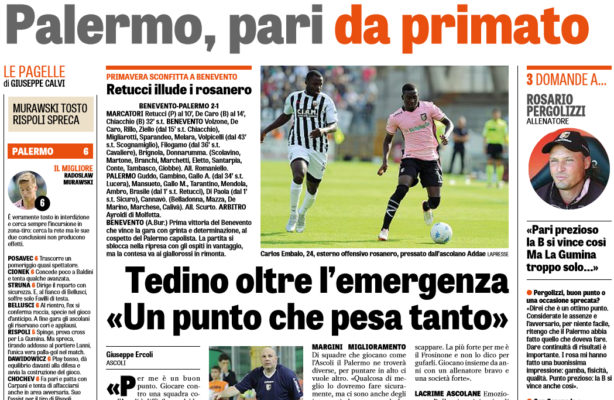 “«Per me è un buon punto. Giocare contro una squadra come l’Ascoli è difficile perché ha un’interpretazione calcistica organizzata che sapevamo avrebbe potuto metterci in difficoltà». Mister Tedino ha posto subito le cose in chiaro in sala stampa dando più meriti all’Ascoli che demeriti ai suoi per lo 0-0 scaturito al termine di una partita brutta e noiosa, con una sola importante palla gol capitata suo i piedi di Rispoli in avvio di ripresa e vanificata dall’uscita di Lanni. Troppo poco per un Palermo ambizioso, ma Tedino non concorda su eventuali critiche alla prestazione dei suoi. «Non è che siamo stati noi troppo macchinosi; il fatto che l’Ascoli abbia scelto di stare dietro la linea della palla e sotto metà campo ha ridotto gli spazi». Ma proprio niente da rimproverare alla squadra? «E’ chiaro che noi in questo momento qualche problema lo abbiamo: le assenze ci stanno creando qualche difficoltà, ma la squadra ha dimostrato grande umiltà, si è calata nella parte difficile del campionato cadetto e lo ha fatto con spirito di sacrificio. Così non fosse, si farebbe una partita scadente. Per me è un punto di soddisfazione». […]”. Questo quanto riportato dall’edizione odierna de “La Gazzetta dello Sport”.