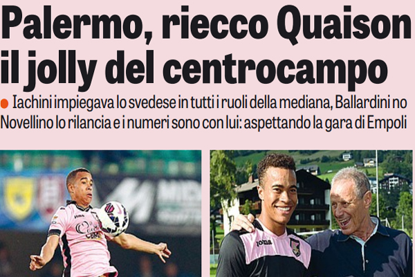 “Di Iachini era il jolly. Con Ballardini solo pochi spezzoni di gara. Gli è andato meglio con Barros Schelotto, di cui poteva considersi un titolare, e con Novellino torna protagonista. Già contro il Napoli ha giocato quasi l’intera partita e domani, ad Empoli, con ogni probabilità sarà tra i prescelti, al là del modulo che sarà scelto. Se Novellino dovesse optare sul 4231, lo svedese sarebbe trequartista laterale. Se invece sarà 4141, l’ex Aik Solna giocherebbe da esterno alto. Scegliendo un modulo più offensivo (rispetto al 352 di Iachini), è quasi ovvia la presenza di Quaison nell’undici titolare. I motivi sono molteplici: perché occupa più ruoli offensivi, è veloce e favorisce le ripartenze, e perché può agire largo sulle fasce, da ala vecchia maniera. Un dettaglio non trascurabile con Novellino in panchina, uno che nella sua carriera ha spesso valorizzato giocatori con queste caratteristiche. JOLLY DI MEDIANA Quest’anno Quaison ha giocato praticamente in tutti i ruoli dal centrocampo in su. Ha fatto il «falso nueve» all’inizio del campionato, quando Gilardino era appena arrivato in rosanero e non era ancora in condizione di giocare. Prima dell’esonero, Iachini lo aveva impiegato da interno di centrocampo e da esterno destro nel suo centrocampo a 5. Successivamente Quaison ha trovato spazio da trequartista, accanto a Vazquez, e da esterno d’attacco nel 433 di Barros Schelotto. Una duttilità «esasperata», che se da un lato lo avvantaggia, dall’altro lo penalizza, perché Quaison non ha mai trovato continuità di ruolo e rendimento. Mancanza d’identità che gli ha tolto sicurezza. PARTENZA SPRINT Quest’estate, in ritiro, non erano in pochi quelli che pronosticavano per Quaison la stagione della consacrazione, in virtù della crescita progressiva mostrata la passata stagione e del fresco titolo di campione d’Europa U.21 di cui poteva fregiarsi al suo arrivo in Trentino. L’inizio era stato più che promettente: prima uscita e subito gol (quello della qualificazione), contro l’Avellino in Coppa Italia: «L’innesto di Quaison ha cambiato la partita – ammise Iachini a fine serata –. Sono sicuro che Robin ci tornerà molto utile». Invece Quaison si è smarrito un po’ alla volta, come molti suoi compagni. Da lui ci si aspettava di più, certo, ma sarebbe ingeneroso addossargli le colpe di una stagione compromessa da scelte societarie sbagliate e ai limiti dell’incredibile. Anzi, a voler dare un’occhiata attenta ai numeri dell’esterno svedese, si può dire che con lui in campo dal primo minuto il Palermo ha fatto meglio che senza. La mediapunti dei rosanero in stagione è di 0,93 a partita. Con Quaison titolare, la media sale a 1,27 (14 i punti in 11 partite, 4 delle quali vinte). Una differenza notevole, che numeri alla mano, potrebbe valere la salvezza”. Questo quanto si legge sull’edizione odierna de “La Gazzetta dello Sport”.