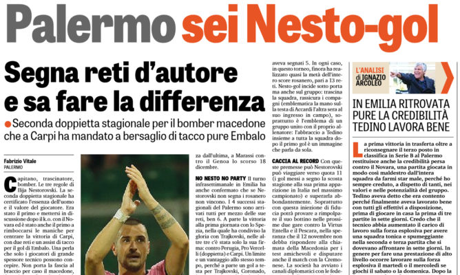 Capitano, trascinatore, bomber. Le tre regole di Ilija Nestorovski. La seconda doppietta stagionale ha certificato l’essenza dell’uomo e il valore del giocatore. Era stato il primo e mettersi in discussione dopo il k.o. con il Novara ed è stato anche il primo a rimboccarsi le maniche per centrare la vittoria di Carpi, con due reti e un assist di tacco per il gol di Embalo. Una perla che solo i giocatori di grande spessore tecnico possono concepire. Non porta la fascia al braccio per caso il macedone, dopo la sconfitta di sabato è andato in mix zone senza usare parole di circostanza, ha messo sul banco degli imputati se stesso e i suoi compagni dicendo che il Palermo contro i piemontesi non aveva giocato da squadra. Carpi ha segnato l’inversione di tendenza, il ritorno alla vittoria dopo quattro turni e soprattutto in trasferta a quasi un anno di stanza dall’ultima, a Marassi contro il Genoa lo scorso 18 dicembre.