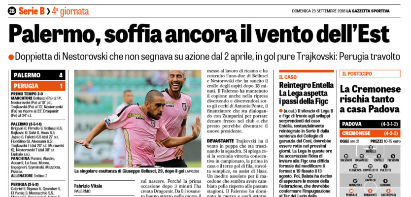 “Il vento dell’Est è tornato a soffiare su Palermo. Un vento gelido per il Perugia, spazzato via dalla continua ascesa di Trajkovski e dal ritorno prepotente di Nestorovski che dopo essersi ripreso la maglia da titolare non si è fatto pregare per marcare il territorio con una doppietta. Vitamina essenziale per l’attaccante che non segnava su azione dallo scorso 2 aprile a Parma e per Tedino che con la chiusura del mercato sta rivedendo sbocciare il capitano dato in partenza. Ma è tutto il Palermo che è stato superiore, per trame di gioco, intensità e cinismo nel colpire sempre al momento giusto. Il Perugia è stato stroncato sul nascere. Perché la prima occasione dopo 3 minuti l’ha creata Dragomir. Da lì i rosanero hanno stretto nella morsa il Grifone con un dinamismo e un fraseggio tra le linee che ha mandato in tilt l’impianto difensivo di Nesta. Trajkovski si è messo al lavoro di ricamo e ha costruito l’uno-due di Bellusci e Nestorovski che ha sancito il crollo degli ospiti dopo 18 minuti. Il Palermo ha mantenuto il copione anche nella ripresa divertendo e divertendosi sotto gli occhi di AntonioPonte, il finanziatore che sta dialogando con Zamparini per portare denaro fresco nel club e che presto potrebbe diventare il nuovo presidente. […]”.