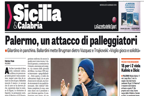 “Alla fine è prevalsa la linea della continuità tattica. La difesa a tre provata negli ultimi giorni è stata accantonata, magari come idea da attuare in corso di gara. Ballardini mescola il mazzo e si accorge che di carte ne ha davvero poche, soprattutto dopo la cessione di Rigoni, la risoluzione di Daprelà e la permanente esclusione di Maresca e di El Kaoutari. Non resta che battere sul solito canovaccio: il 4-3-1-2 che però questo pomeriggio presenterà lo stesso qualche novità. Gilardino non giocherà la sfida da ex, almeno dall’inizio. Il tecnico ha studiato un attacco di palleggiatori con Brugman alle spalle di Vazquez e Trajkovski. Contro una Fiorentina spietata nel fraseggio, Ballardini prova a rispondere con le stesse armi, resta da vedere con quali risultati, visto che nessuno dei tre uomini offensivi è un bomber. Spera in un regalo di compleanno da parte dei suoi ragazzi, l’allenatore ravvenate che oggi compie 51 anni. Il fatto che sarà la quarta formazione diversa, soprattutto per quanto concerne l’assetto offensivo, in sei gare sotto la sua gestione conferma che ancora la quadra non è stata trovata. I rinforzi di gennaio, a cominciare da Cristante, aiuteranno nel compito. «Lo conosco dalle giovanili del Milan, è un classe 1995 molto interessante – spiega Ballardini -. Detto questo, si vedrà che collocazione dargli, da un paio d’anni non lo vedo più, ma ricordo sicuramente le sue qualità interessanti. Altri rinforzi? Dobbiamo completare la rosa, sono stato chiaro con il presidente e con il direttore sportivo. Ci confrontiamo ogni giorno, già con Rigoni, Maresca e Daprelà la rosa era da completare, figuriamoci ora che questi ragazzi non ci sono. La società ha le sue strategie, a volte sono strategie conformi alle richieste dell’allenatore, altre bisogna adattarsi». BASTA ERRORI Innesti nuovi a parte, restano da colmare le lacune difensive viste nelle ultime cinque gare in cui i rosanero hanno incassato ben 10 gol. «Alla Juve abbiamo concesso poco, siamo stati fragili con l’Atalanta, col Frosinone abbiamo rischiato poco, mentre contro la Samp abbiamo fatto errori che in A non puoi fare – ammette il tecnico -. Credo che questa squadra con questi giocatori deve pretendere di essere maggiormente solida, per non commettere gli stessi errori. Con la Fiorentina confido in una prestazione fatta di solidità e qualità di gioco, questo lo cerchiamo tutti i giorni. Una grande partita da parte della mia squadra sarebbe il miglior regalo per il mio compleanno». Un pensiero su Gilardino. Zamparini ha dichiarato che non lo ha pienamente soddisfatto. Ballardini prova a fare da pompiere, anche se nel caso in cui non dovesse mandarlo in campo dall’inizio confermerebbe di pensarla come il patron. «Penso che Gilardino potrà giocare ancora qualche anno a livello importante. Ha le sue caratteristiche, al Palermo ha anche dato una mano importante e siamo contenti di averlo con noi»”. Questo quanto scrive l’edizione odierna de “La Gazzetta dello Sport”.