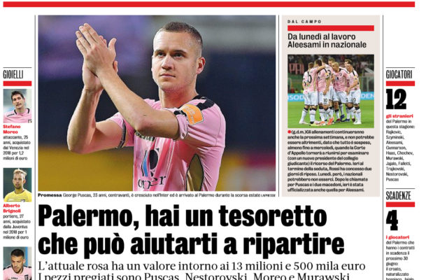 L’edizione odierna della “Gazzetta dello Sport”, parla del futuro del Palermo. Ci vorranno ancora quattro giorni prima della pronuncia della Corte Federale d’Appello che dovrà decidere se confermare la retrocessione in C o riabilitare il Palermo in serie B. L’incertezza può influire anche sul valore complessivo dell’organico, che potrebbe variare a seconda della categoria nella quale giocherà il Palermo. Con la vendita dei prezzi pregiati, la nuova società dovrà rifondare la rosa, ma l’attuale parco giocatori ha perso valore. Quattro giocatori andranno a scadenza a giugno, Jajalo, Rispoli, Aleesami e Pomini, sottraendo quindi valore contrattuale all’organico. Il valore complessivo dell’intero organico si aggira intorno ai 13.6 milioni di euro. In serie C la società sarebbe costretta a vendere per far cassa, mentre in caso di una permanenza nella serie cadetta, la valutazione arriverebbe intorno ai 15 milioni. Il pezzo forte è senza dubbio Puscas, che il Palermo non può vendere per meno di 3 milioni, cifra d’acquisto. Il valore del rumeno dipenderà anche dalle sue prossime prestazioni con la propria nazionale nell’Europeo under 21. L’altro pezzo pregiato potrebbe essere Nestorovski. Lo scorso anno non si è trovato un acquirente per il macedone, la cui valutazione era di circa 4 milioni di euro. Adesso il Palermo dal suo capitano potrebbe ricavare circa 2,5 milioni, magari guardando al mercato estero. Moreo è un altro elemento che potrebbe essere ceduto alla stessa cifra rispetto alla quale è stato acquistato dal Venezia: 1,2 milioni di euro. Trajkovski ha una valutazione di circa 600 mila euro, mentre Lo Faso nonostante gli infortuni, può far gola a molti. Un altro milione potrebbe arrivare dalla cessione di Murawski, mentre poi ci sono i giocatori con un solo anno rimanente di contratto come Rajkovic, Bellusci ed Embalo che potrebbero portare 500 mila euro a testa. Tra i rientri, Posavec potrebbe essere riscattato dall’Hajduk Spalato per una cifra complessiva di 750 mila euro.
