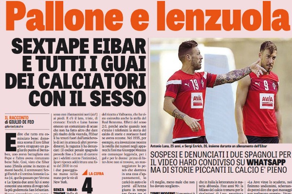 Gazzetta dello Sport: “Pallone e lenzuola: sospesi e denunciati i due spagnoli per il video hard condiviso su Whatsapp. Ma di storie piccanti il calcio ne è pieno”