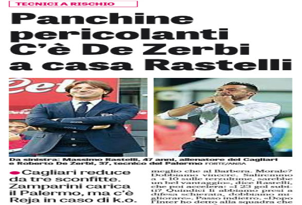 “Paura nelle isole. Cagliari-Palermo è il posticipo degli allenatori a rischio. Rastelli non può perdere altri punti, per De Zerbi forse siamo già all’ultima spiaggia. «Ci giochiamo una fetta di salvezza», sentenzia l’allenatore dei sardi, che perde pezzi (k.o. Capuano) ma evita le scorciatoie: «Affrontiamo una squadra che ha qualità e gamba, giocatori come Rispoli e Aleesami che spingono sulle fasce, Diamanti che può sempre tirare fuori il coniglio dal cilindro, Nestorovski, ottimo realizzatore». Analisi secca. Con i siciliani a 6 punti, il derby delle isole si annuncia tirato. «Il Palermo ha messo in difficoltà la Juve e in trasferta fa