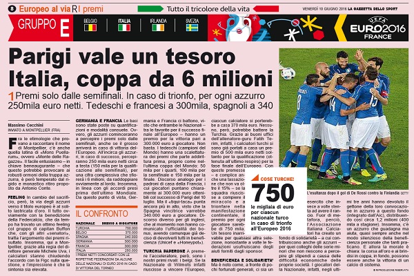 Gazzetta dello Sport: “Parigi vale un tesoro. Italia, coppa da 6 milioni. Premi solo dalle semifinali. In caso di trionfo, per ogni azzurro 250mila euro netti. I tedeschi e gli spagnoli…”