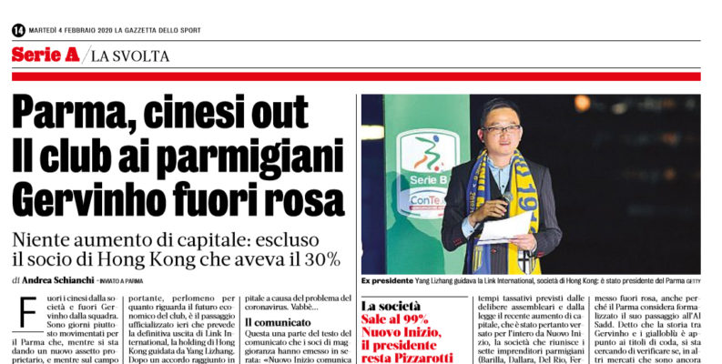 L’edizione odierna della “Gazzetta dello Sport” si sofferma sul passaggio di proprietà in casa Parma. Ieri è uscita di scena Link International, la holding di Hong Kong guidata da Lizhang. Dopo un accordo raggiunto in dicembre, che distribuiva le quote del Parma dando il 60% delle azioni ai soci parmigiani, il 30% ai cinesi e il 10% ad una società di azionariato popolare, Lizhang si è nuovamente volatilizzato, adducendo l’impossibilità di completare l’operazione finanziaria dell’aumento di capitale a causa del coronavirus. Adesso, il 99% delle quote è detenuto da “Nuozo Inizio”, mentre l’1% a PPC. La società principale è guidata dai 7 imprenditori parmigiani (Barilla, Dallara, Del Rio, Ferrari, Gandolfi, Malmesi e Pizzarotti) che hanno rifondato il Parma Calcio nel 2015. Formalmente non cambia nulla, il presidente resta Pizzarotti. Nel mentre, il DS Faggiano dovrà gestire il caso Gervinho, messo fuori rosa, anche perché il Parma considera formalizzato il suo passaggio all’Al Sadd.