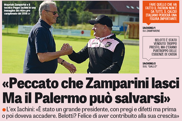 Gazzetta dello Sport: “«Peccato che Zamparini lasci. Ma il Palermo può salvarsi». L’ex Iachini: «È stato un grande presidente, con pregi e difetti ma…»”