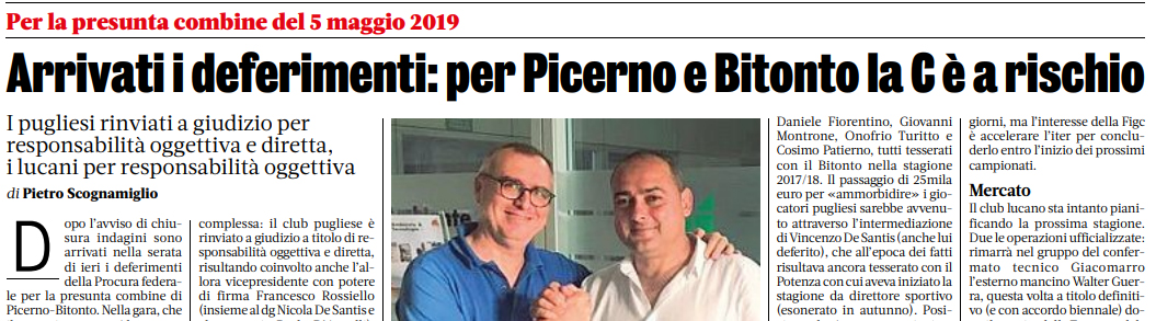 L’edizione odierna della “Gazzetta dello Sport” si sofferma sui deferimenti relativi alla presunta combine del 5 maggio 2019. Nella serata di ieri sono arrivati i deferimenti della Procura federale per la presunta combine di Picerno-Bitonto. Nella gara si sarebbe consumato secondo l’accusa un illecito finalizzato ad alterare il risultato. Il club pugliese è rinviato a giudizio a titolo di responsabilità oggettiva e diretta, per il Picerno responsabilità soltanto oggettiva.