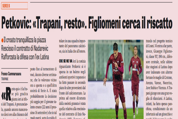 Gazzetta dello Sport: “Petkovic: «Trapani, resto». Il croato tranquillizza la piazza. Nadarevic rescinde, per la difesa ecco Figliomeni”