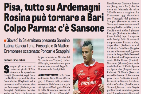 Gazzetta dello Sport: “Pisa, tutto su Ardemagni, Rosina può tornare a Bari. Colpo Parma: c’è Sansone. Giovedì la Salernitana presenta Sannino”
