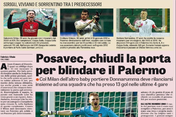 “Alzare il muro al Diavolo. È quasi un obbligo dopo le 13 reti incassate in quattro partite. Per farlo servirà rivedere anche lo Josip Posavec delle prime giornate, quello che nelle prime sei gare aveva subito soltanto 8 reti, per merito della tenuta difensiva, ma anche grazie a una serie d’interventi che chiusero letteralmente la porta agli avversari. Riavvolgendo il nastro, le parate con Sassuolo (che ha vinto grazie a un rigore), Inter, Atalanta, Juventus (che ha vinto per un autogol) e Sampdoria sono rimaste lì, nella bacheca di questo campionato. Contro il Milan sarà necessario ritrovare un Palermo più solido e un Posavec più determinante. SFIDA TRA BABY La sfida a distanza con Donnarumma non può che esaltarlo. Sono loro i due portieri titolari più giovani della Serie A. Il rossonero non è ancora maggiorenne, il croato dall’alto dei suoi 20 anni proverà a evidenziare le sue qualità confermando anche in questo modo il pensiero del presidente Zamparini che lo accosta al portierino del Milan. Posavec è caduto, un po’ come tutta la squadra, nella sindrome post sosta di campionato che ha fatto entrare i rosanero nel tunnel della crisi con quattro sconfitte consecutive e con una ricaduta sull’autostima generale diventata fragile come un cristallo. L’ex Inter Zapresic, tra le tante scommesse sulle quali ha puntato il presidente in questa stagione, è quella che ha risposto meglio, insieme a Nestorvoski, però anche lui sta vivendo una flessione. Il reparto arretrato nelle ultime gare non l’ha aiutato molto. Se gli si devono imputare delle responsabilità, Posavec ha sbagliato soltanto la gara con la Roma nella quale su 4 gol incassati 3 sono arrivati per errori suoi. Per il resto, ha provato a dare il meglio di sé. Non era sempliceper il croato raccogliere l’eredità di Sorrentino, un portiere di esperienza che, di fatto, ha condotto il Palermo alla salvezza nella scorsa stagione, oltre a essere stato protagonista e leader indiscusso delle ultime quattro stagioni. Ma mentre all’inizio del campionato poteva esserci l’entusiasmo di sentirsi titolare indiscusso in Serie A, adesso c’è da gestire il peso di una classifica pessima che richiede un sussulto di personalità per scalare posizioni. GLI ALTRI NUMERI UNO Il ruolo del portiere non è stato mai semplice a Palermo, per anni è stata una vera e propria maledizione che ha colpito tutti i protagonisti. I giovani sempre preferiti da Zamparini sono stati scavalcati degli estremi difensori esperti. Andujar, Agliardi, Santoni, Ujkani hanno tutti fallito per il grande peso della piazza. Anche un portiere di media esperienza come Amelia ebbe parecchie difficoltà. Sono stati necessari rimpiazzi navigati come Fontana, Viviano e appunto Sorrentino. L’unico giovane ad avere sfondato è stato Sirigu, lanciato da Zenga al posto di Amelia, perché per il tecnico dava più garanzie. Fu l’unica intuizione vincente di quella gestione che fruttò anche una bella plusvalenza al patron con la cessione al Psg. Finora Sirigu è l’unica giovane scommessa in porta vinta dal presidente. La speranza ora è che Posavec confermi le attese riposte su di lui”. Questo quanto si legge su “La Gazzetta dello Sport”.