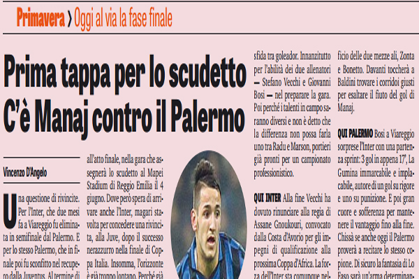 Gazzetta dello Sport: “Primavera, oggi al via la fase finale. Prima tappa per lo scudetto, c’è Manaj contro il Palermo”