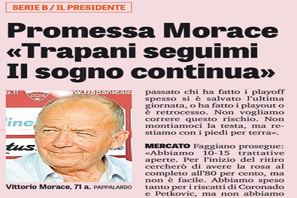“«Abbiamo sognato. Ebbene, vogliamo continuare a sognare. Abbiamo iniziato una strada importante quest’anno, adesso vogliamo far tesoro di quello che la stagione appena trascorsa ci ha insegnato»: così in sintesi il presidente Vittorio Morace a margine di un incontro che il d.s. Daniele Faggiano ha avuto con i giornalisti. Come consuetudine poche parole ma piene di significato quelle di Morace, tornato dalla Spagna per le vacanze estive e, per l’occasione, accompagnato dal figlio Ettore. «Abbiamo le potenzialità per mantenerci a certi livelli – dice da parte sua Faggiano –. La voglia e l’entusiasmo per fare meglio c’è, personalmente sono anche molto ambizioso altrimenti non sarei rimasto, però l’obiettivo principale rimane la salvezza, per poi vedere cosa succede. In passato chi ha fatto i playoff spesso si è salvato l’ultima giornata, o ha fatto i playout o è retrocesso. Non vogliamo correre questo rischio. Non montiamoci la testa, ma restiamo con i piedi per terra». MERCATO Faggiano prosegue: «Abbiamo 1015 trattative aperte. Per l’inizio del ritiro cercherò di avere la rosa al completo all’80 per cento, ma non è facile. Abbiamo speso tanto per i riscatti di Coronado e Petkovic, ma non abbiamo l’obbligo di vendere e, se vendiamo, non è detto che dobbiamo per forza comprare. L’unica vera richiesta che ci è stata fatta è per Petkovic. Non lo svendiamo, però. Vorremmo confermare Eramo, vedremo a giorni le intenzioni della Sampdoria. Anche con la Lazio la trattativa è aperta (per Crecco e Guerrieri, ndr), ci incontreremo la settimana prossima. Forse prenderemo un terzino destro. Sia ben chiaro, però, che chi viene nel Trapani deve arrivare con la voglia di conquistare un’altra finale e lo stesso entusiasmo di chi sta per approdare alla Juve o al Real Madrid». SETTORE GIOVANILE Rivoluzione in vista a sentire Faggiano: «Di Gaetano non sarà l’allenatore della Primavera, è giusto che faccia la sua strada. L’idea è quella di dare al settore una diversa organizzazione, con a capo sempre Mario Gabriele, ottimizzando però le spese. Arriverà qualcun altro a darci una mano. Il problema resta la mancanza di strutture»”. Questo quanto si legge sull’edizione odierna de “La Gazzetta dello Sport”.